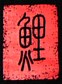 Красная печать с иероглифами (имя дизайнера) спереди внизу футболки справа.