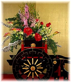 астр, маргариток и глициний в вазе на цветочной повозке - тема