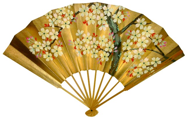 цветущей ветви сакуры на золотом поле на одной стороне веера