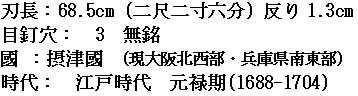 - Длина клинка нагаса: 68.5 cm (2.26 Shaku)