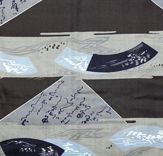 с рисунком в виде вееров и старинных рукописей. Кимоно